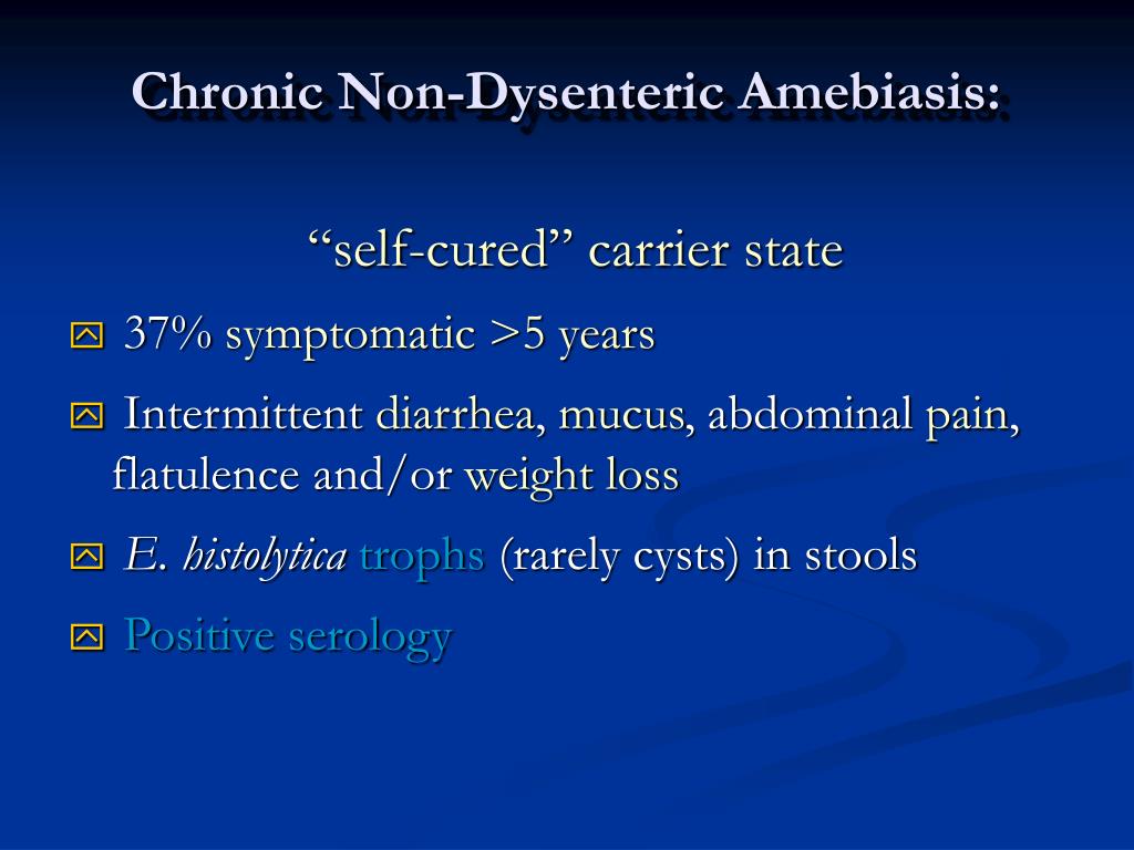 Chronic Non-Dysenteric Amebiasis: “self-cured” carrier state • 37% symptomatic >5 years • Intermittent diarrhea, mucus, abdominal pain, flatulence and/or weight loss • E. histolyticatrophs (rarely cysts) in stools • Positive serology