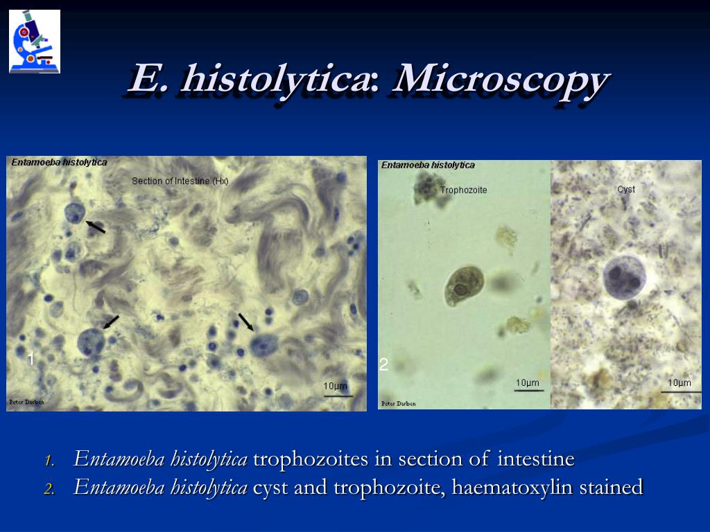E. histolytica: Microscopy • Entamoeba histolytica trophozoites in section of intestine • Entamoeba histolytica cyst and trophozoite, haematoxylin stained 1 2