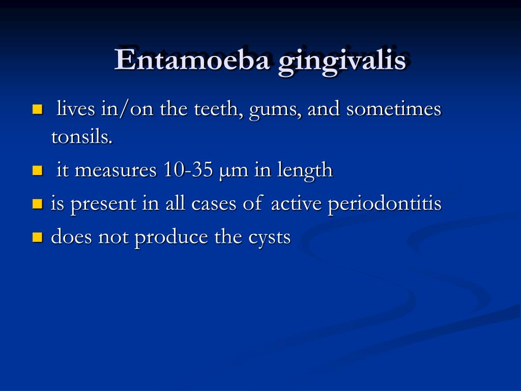 Entamoeba gingivalis • lives in/on the teeth, gums, and sometimes tonsils. • it measures 10-35 µm in length • is present in all cases of active periodontitis • does not produce the cysts