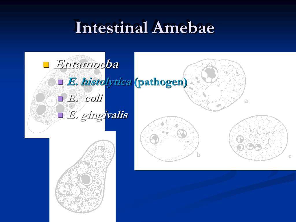 Intestinal Amebae • Entamoeba • E. histolytica(pathogen) • E. coli • E. gingivalis