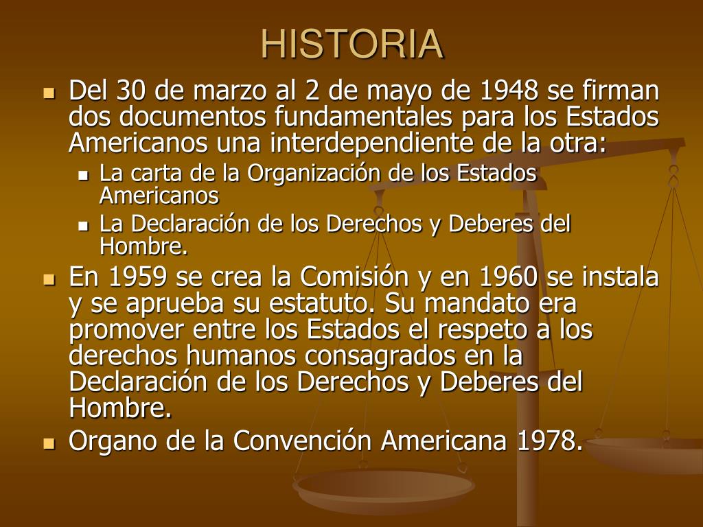 HISTORIA • Del 30 de marzo al 2 de mayo de 1948 se firman dos documentos fundamentales para los Estados Americanos una interdependiente de la otra: • La carta de la Organización de los Estados Americanos • La Declaración de los Derechos y Deberes del Hombre. • En 1959 se crea la Comisión y en 1960 se instala y se aprueba su estatuto. Su mandato era promover entre los Estados el respeto a los derechos humanos consagrados en la Declaración de los Derechos y Deberes del Hombre. • Organo de la Convención Americana 1978.