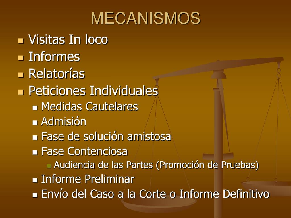 MECANISMOS • Visitas In loco • Informes • Relatorías • Peticiones Individuales • Medidas Cautelares • Admisión • Fase de solución amistosa • Fase Contenciosa • Audiencia de las Partes (Promoción de Pruebas) • Informe Preliminar • Envío del Caso a la Corte o Informe Definitivo