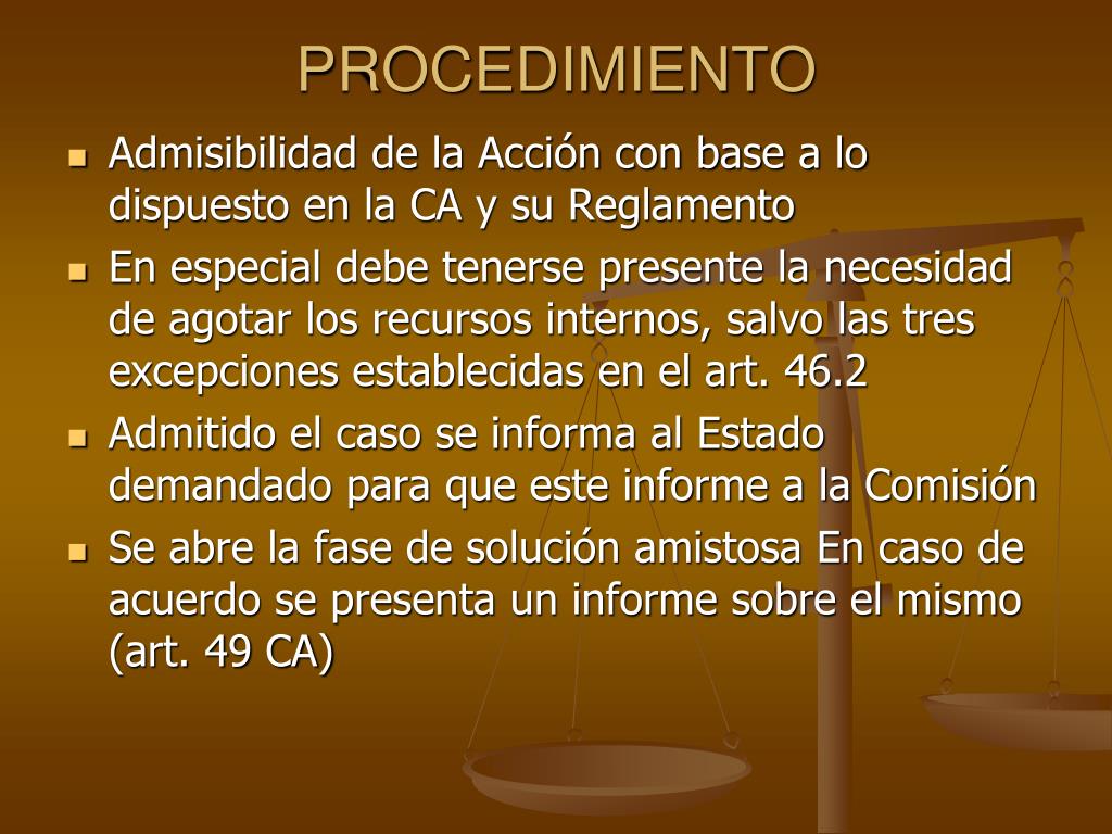PROCEDIMIENTO • Admisibilidad de la Acción con base a lo dispuesto en la CA y su Reglamento • En especial debe tenerse presente la necesidad de agotar los recursos internos, salvo las tres excepciones establecidas en el art. 46.2 • Admitido el caso se informa al Estado demandado para que este informe a la Comisión • Se abre la fase de solución amistosa En caso de acuerdo se presenta un informe sobre el mismo (art. 49 CA)