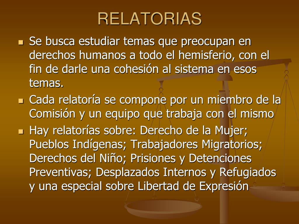 RELATORIAS • Se busca estudiar temas que preocupan en derechos humanos a todo el hemisferio, con el fin de darle una cohesión al sistema en esos temas. • Cada relatoría se compone por un miembro de la Comisión y un equipo que trabaja con el mismo • Hay relatorías sobre: Derecho de la Mujer; Pueblos Indígenas; Trabajadores Migratorios; Derechos del Niño; Prisiones y Detenciones Preventivas; Desplazados Internos y Refugiados y una especial sobre Libertad de Expresión