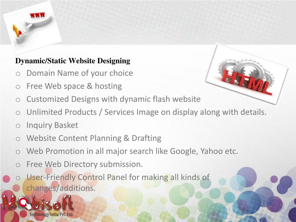Dynamic/Static Website Designing • Domain Name of your choice • Free Web space & hosting • Customized Designs with dynamic flash website • Unlimited Products / Services Image on display along with details. • Inquiry Basket • Website Content Planning & Drafting • Web Promotion in all major search like Google, Yahoo etc. • Free Web Directory submission. • User-Friendly Control Panel for making all kinds of changes/additions.