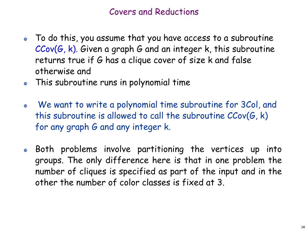 Covers and Reductions • To do this, you assume that you have access to a subroutine CCov(G, k).Given a graph G and an integer k, thissubroutine returns true if G has a clique cover of size k and false otherwise and • This subroutineruns in polynomial time • We want to write a polynomial time subroutine for 3Col, and this subroutine is allowed to call the subroutineCCov(G, k) for any graph G and any integer k. • Both problems involve partitioning the vertices up into groups. The only difference here is that in one problemthe number of cliques is specified as part of the input and in the other the number of color classes is fixed at 3.