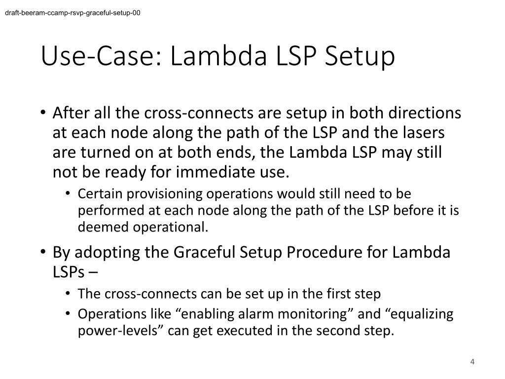 draft-beeram-ccamp-rsvp-graceful-setup-00 Use-Case: Lambda LSP Setup • After all the cross-connects are setup in both directions at each node along the path of the LSP and the lasers are turned on at both ends, the Lambda LSP may still not be ready for immediate use. • Certain provisioning operations would still need to be performed at each node along the path of the LSP before it is deemed operational. • By adopting the Graceful Setup Procedure for Lambda LSPs – • The cross-connects can be set up in the first step • Operations like “enabling alarm monitoring” and “equalizing power-levels” can get executed in the second step.