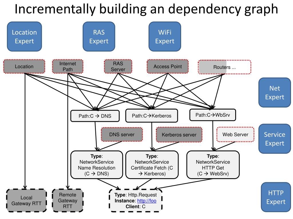 Incrementally building an dependency graph Location Expert RAS Expert WiFi Expert Location Internet Path RAS Server Access Point Routers ... Net Expert Path:CKerberos Path:CWbSrv Path:C DNS Service Expert Kerberos server Web Server DNS server Type: NetworkService Name Resolution (C DNS) Type: NetworkService Certificate Fetch (C Kerberos) Type: NetworkService HTTP Get (C WebSrv) HTTP Expert Local Gateway RTT Remote Gateway RTT Type: Http.Request Instance: http://foo Client: C