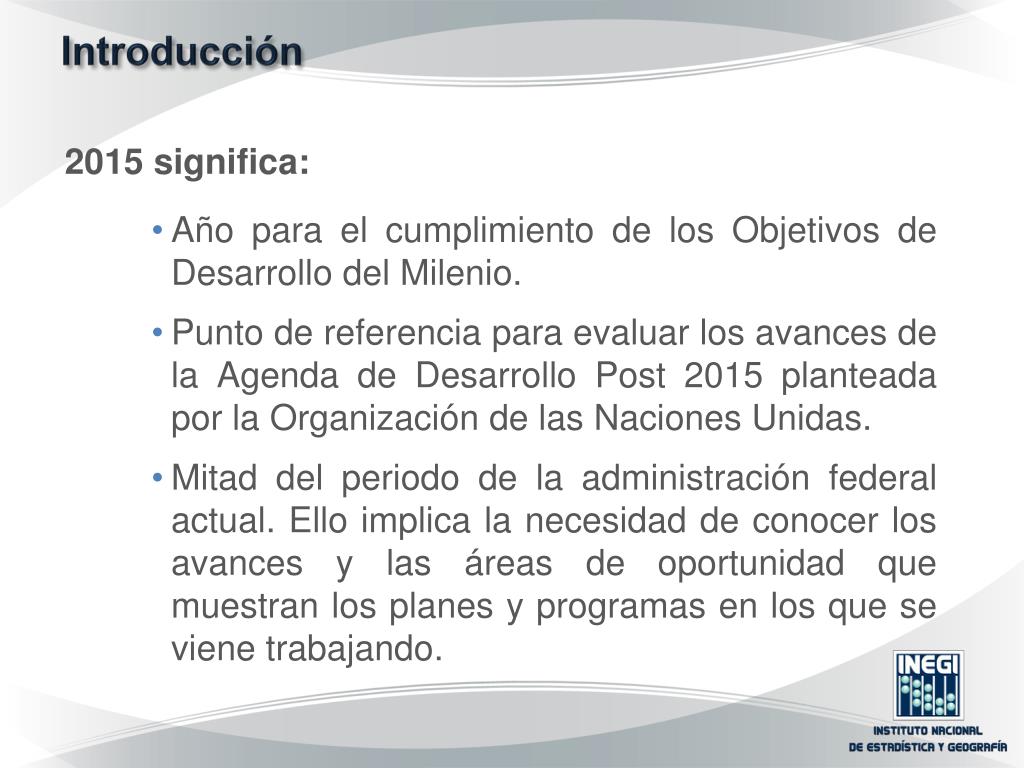 Introducción 2015 significa: • Año para el cumplimiento de los Objetivos de Desarrollo del Milenio. • Punto de referencia para evaluar los avances de la Agenda de Desarrollo Post 2015 planteada por la Organización de las Naciones Unidas. • Mitad del periodo de la administración federal actual. Ello implica la necesidad de conocer los avances y las áreas de oportunidad que muestran los planes y programas en los que se viene trabajando.