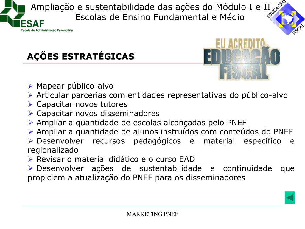 Objetivos estratégicos do PNEF • Disseminar informações e conceitos sobre a gestão fiscal, favorecendo a compreensão e a intensificação da participação social nos processos de geração, aplicação e fiscalização dos recursos públicos. • Construir um modelo dialógico para a produção de referências, conhecimentos e intervenções pedagógicas adequado às características regionais na promoção da educação fiscal. • Institucionalizar o PNEF nas esferas do governo federal, estadual e municipal, desenvolvendo ações permanentes de sensibilização. • Estimular a prática interdisciplinar nas ações de educação fiscal, capacitando de forma continuada agentes multiplicadores. • Manter orientação nacional normativa quanto à implementação das ações do PNEF. • Manter controle e avaliação das ações de educação fiscal. MARKETING PNEF