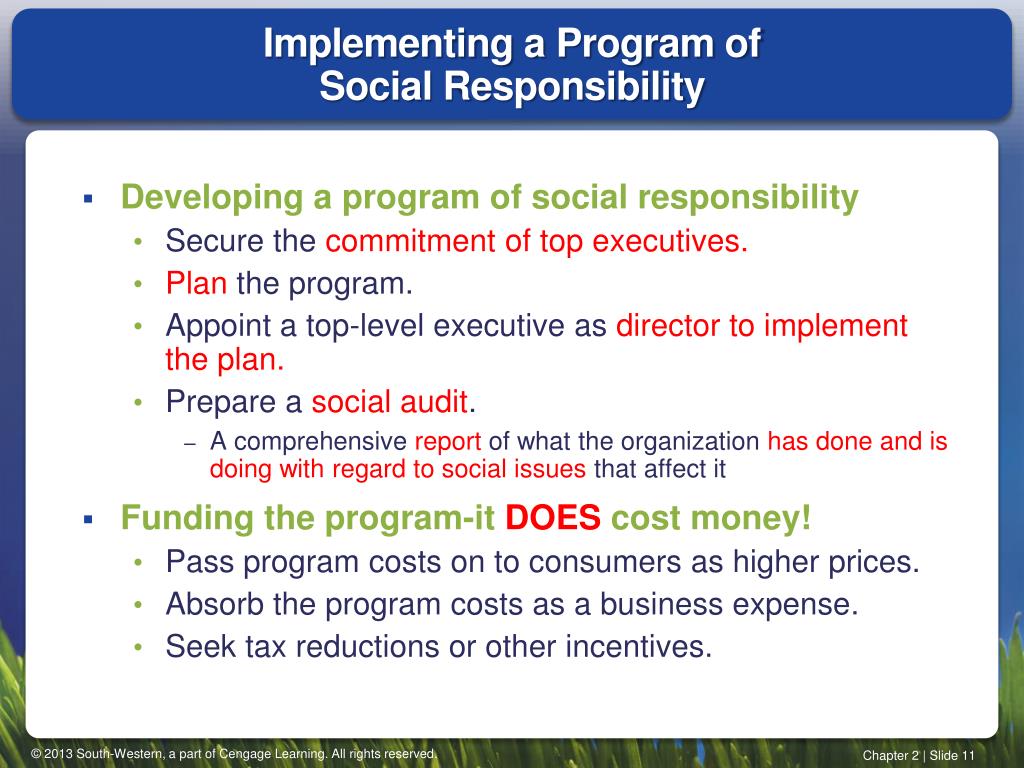 Implementing a Program of Social Responsibility • Developing a program of social responsibility • Secure the commitment of top executives. • Plan the program. • Appoint a top-level executive as director to implement the plan. • Prepare a social audit. • A comprehensive report of what the organization has done and is doing with regard to social issues that affect it • Funding the program-it DOES cost money! • Pass program costs on to consumers as higher prices. • Absorb the program costs as a business expense. • Seek tax reductions or other incentives.