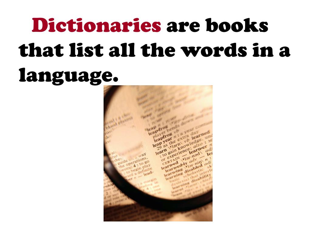 With a Dictionary, you can learn: -How to spell a word -What a word means -How to say a word -What part of speech a word is -How many syllables are in a word -Whether or not to capitalize a word -How to abbreviate a word (ex= USA) -Meanings of prefixes and suffixes for a word