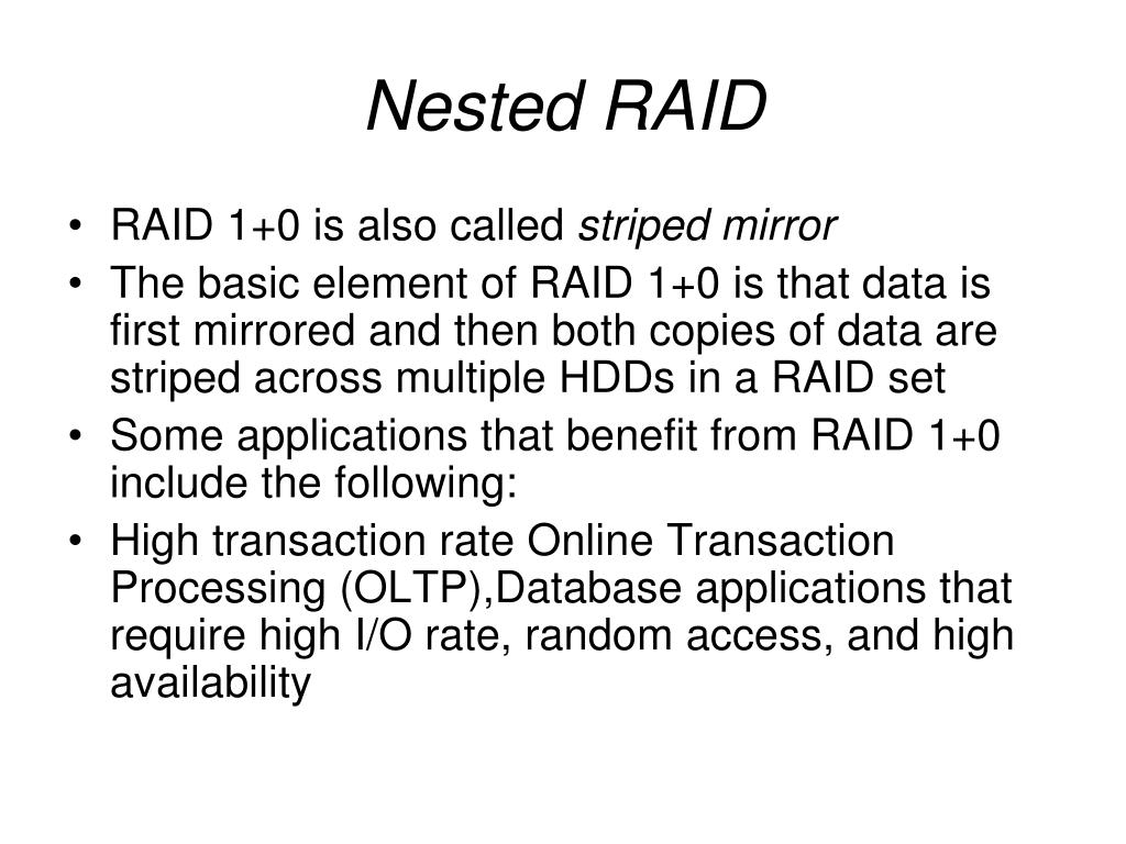 Nested RAID • RAID 1+0 is also called striped mirror • The basic element of RAID 1+0 is that data is first mirrored and then both copies of data are striped across multiple HDDs in a RAID set • Some applications that benefit from RAID 1+0 include the following: • High transaction rate Online Transaction Processing (OLTP),Database applications that require high I/O rate, random access, and high availability