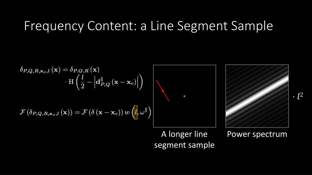 Blue-noise Sampling: Line Segment Samples • A line segment sample is equiv. to a weighted point sample • The weights are determined only by the directions and lengths of the line segment samples • Assumption: the lengths of all samples are the same