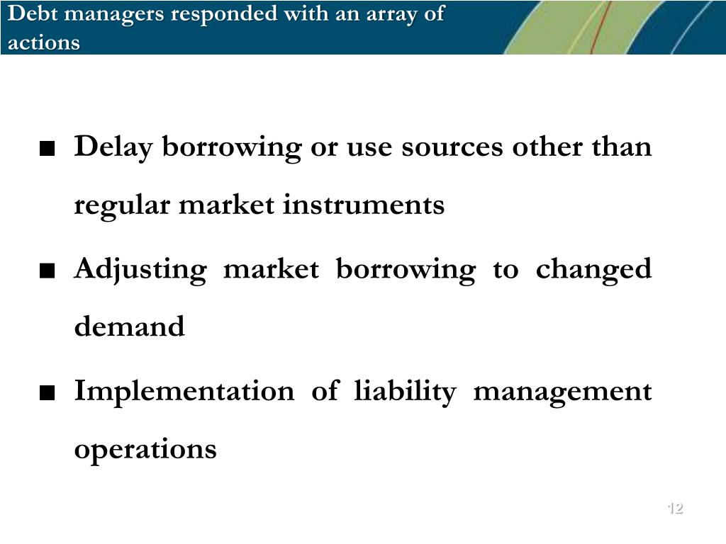 Debt managers responded with an array of actions • Delay borrowing or use sources other than regular market instruments • Adjusting market borrowing to changed demand • Implementation of liability management operations