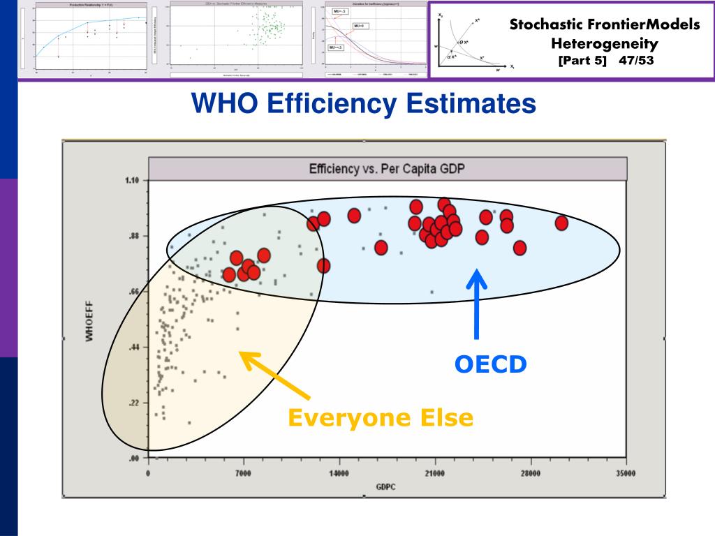 Latent Class Efficiency Studies • Battese and Coelli – growing in weather “regimes” for Indonesian rice farmers • Kumbhakar and Orea – cost structures for U.S. Banks • Greene (Health Economics, 2005) – revisits WHO Year 2000 World Health Report • Kumbhakar, Parmeter, Tsionas (JE, 2013) – U.S. Banks.