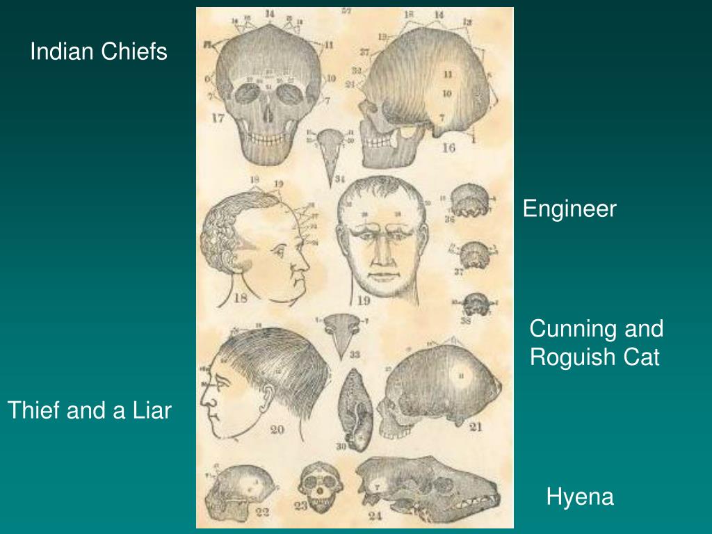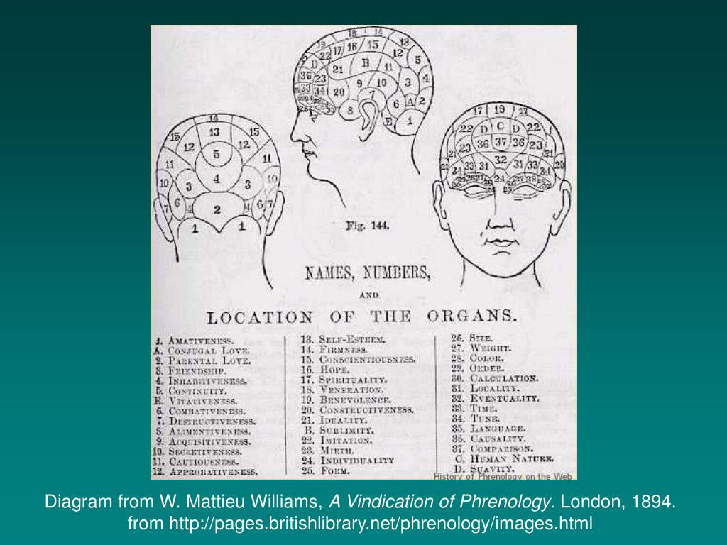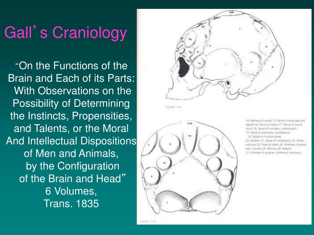 A Selection of Gall’s 27 Faculties the instinct of generation (sexual instinct) love of offspring (philoprogenitiveness), attachment, self-defense, carnivorous instinct--likened to a disposition to murder, cunning, sense of property, pride, vanity and ambition, cautiousness, memory of things, sense of locality, recognition of persons, verbal memory, color-sense, talent for music, numerical ability, comparative ability, metaphysical abilities, wit, poetry, goodness, religious sensibility, and others.