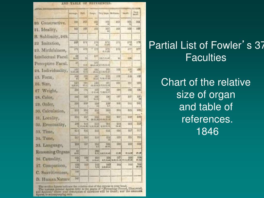 Partial List of Fowler’s 37 Faculties Chart of the relative size of organ and table of references. 1846