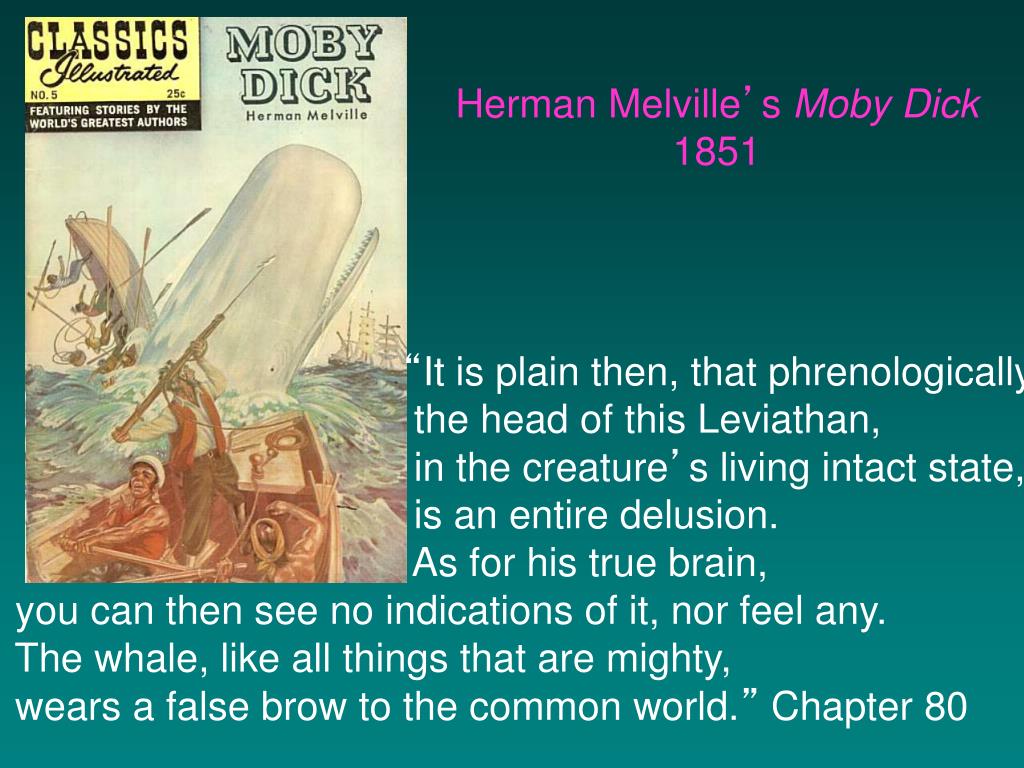 Herman Melville’s Moby Dick 1851 “It is plain then, that phrenologically the head of this Leviathan, in the creature’s living intact state, is an entire delusion. As for his true brain, you can then see no indications of it, nor feel any. The whale, like all things that are mighty, wears a false brow to the common world.” Chapter 80