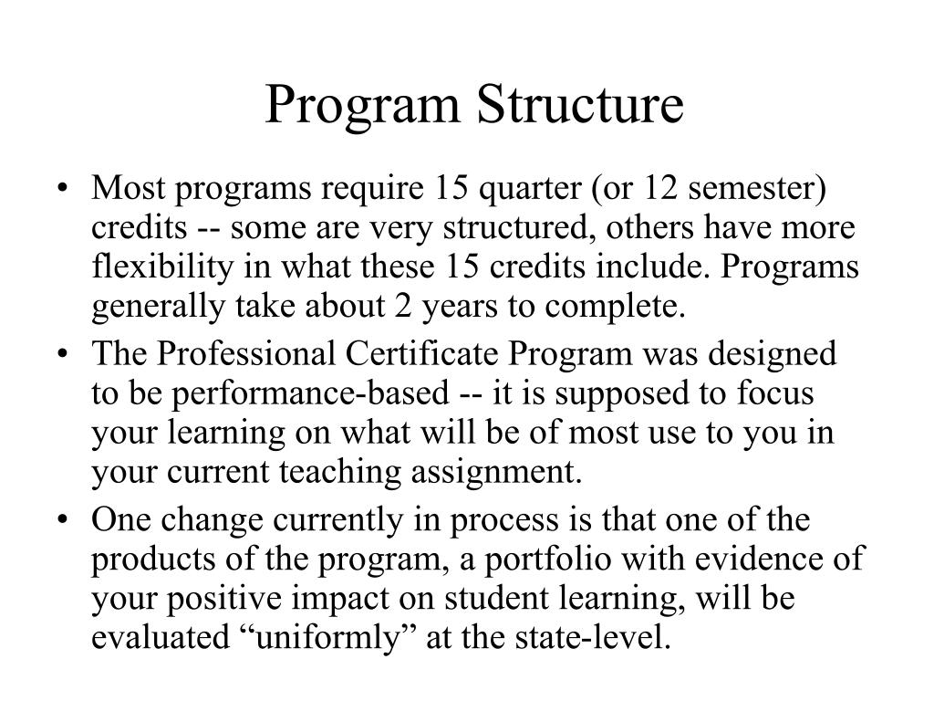 Program Structure • Most programs require 15 quarter (or 12 semester) credits -- some are very structured, others have more flexibility in what these 15 credits include. Programs generally take about 2 years to complete. • The Professional Certificate Program was designed to be performance-based -- it is supposed to focus your learning on what will be of most use to you in your current teaching assignment. • One change currently in process is that one of the products of the program, a portfolio with evidence of your positive impact on student learning, will be evaluated “uniformly” at the state-level.