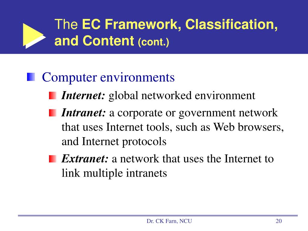 The EC Framework, Classification, and Content (cont.) • Computer environments • Internet: global networked environment • Intranet:a corporate or government network that uses Internet tools, such as Web browsers, and Internet protocols • Extranet: a network that uses the Internet to link multiple intranets Dr. CK Farn, NCU