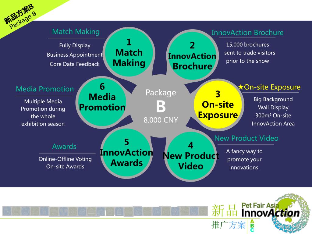 新品方案B Package B InnovAction Brochure Direct mailing to 5000 high-quality buyers prior to the show. 5 InnovAction Awards 4 New Product Video Show your new products information, picture and booth #. 6 Media Promotion Package B 3 On-site Exposure 1 Exhibitor Center Direct mailing to extra 5000 pet shops , media and cooperation partners. 2 InnovAction Brochure 新品 推广方案 A B C