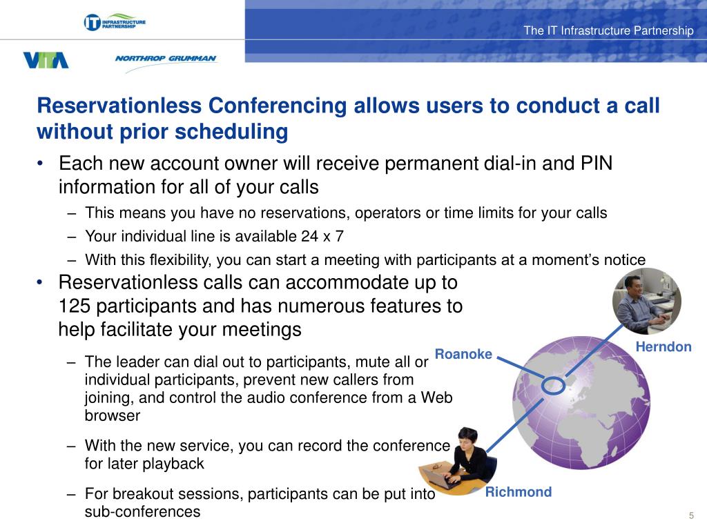 Herndon Roanoke Richmond Reservationless Conferencing allows users to conduct a call without prior scheduling • Each new account owner will receive permanent dial-in and PIN information for all of your calls • This means you have no reservations, operators or time limits for your calls • Your individual line is available 24 x 7 • With this flexibility, you can start a meeting with participants at a moment’s notice • Reservationless calls can accommodate up to 125 participants and has numerous features to help facilitate your meetings • The leader can dial out to participants, mute all or individual participants, prevent new callers from joining, and control the audio conference from a Web browser • With the new service, you can record the conference for later playback • For breakout sessions, participants can be put into sub-conferences