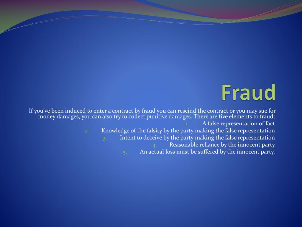 Fraud If you’ve been induced to enter a contract by fraud you can rescind the contract or you may sue for money damages, you can also try to collect punitive damages. There are five elements to fraud: A false representation of fact Knowledge of the falsity by the party making the false representation Intent to deceive by the party making the false representation Reasonable reliance by the innocent party An actual loss must be suffered by the innocent party.