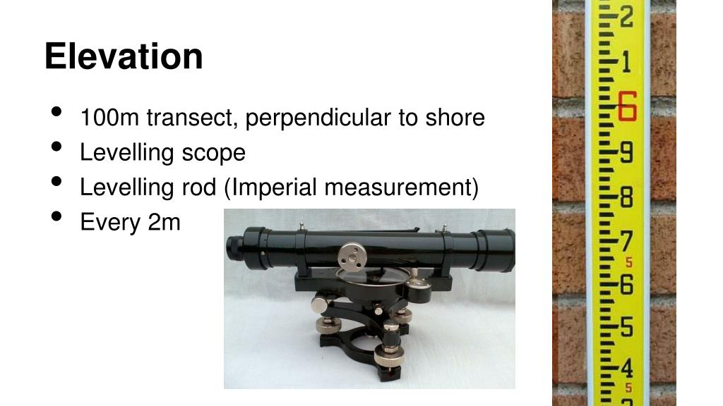 Elevation • 100m transect, perpendicular to shore • Levelling scope • Levelling rod (Imperial measurement) • Every 2m