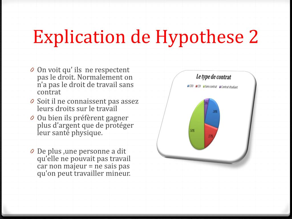 Explication de Hypothese 2 • On voit qu’ils ne respectent pas le droit. Normalement on n'a pas le droit de travail sans contrat • Soit il ne connaissent pas assez leurs droits sur le travail • Ou bien ils préfèrent gagner plus d’argent que de protéger leur santé physique. • De plus ,une personne a dit qu’elle ne pouvait pas travail car non majeur = ne sais pas qu'on peut travailler mineur.
