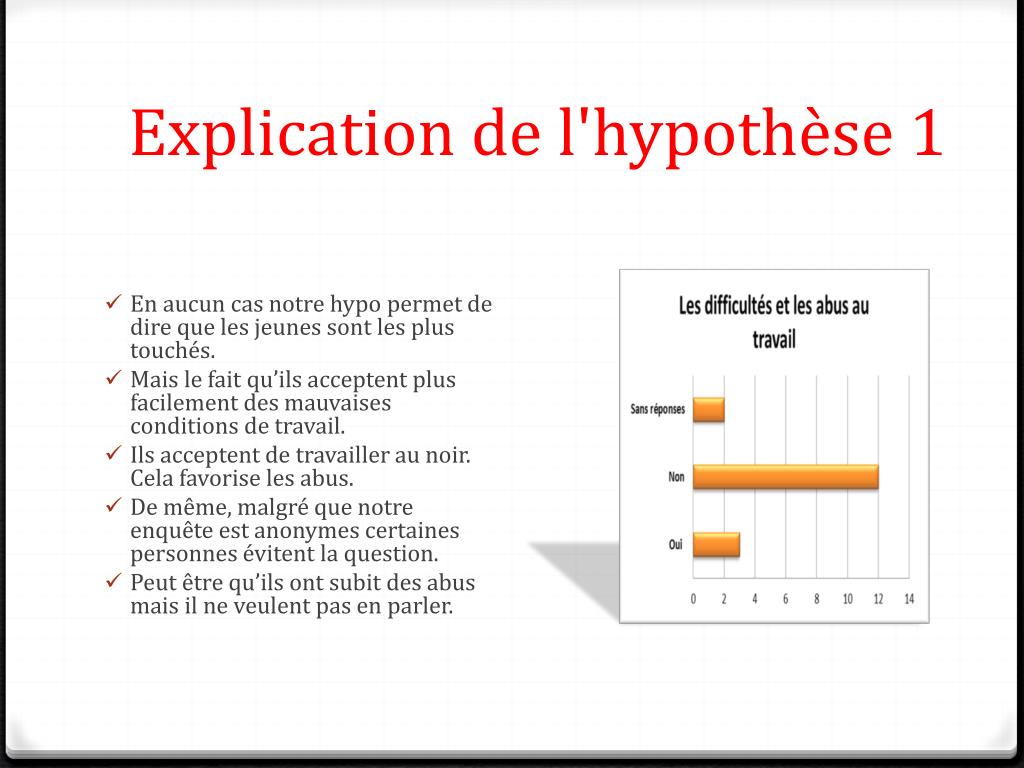 Explication de l'hypothèse 1 • En aucun cas notre hypo permet de dire que les jeunes sont les plus touchés. • Mais le fait qu’ils acceptent plus facilement des mauvaises conditions de travail. • Ils acceptent de travailler au noir. Cela favorise les abus. • De même, malgré que notre enquête est anonymes certaines personnes évitent la question. • Peut être qu’ils ont subit des abus mais il ne veulent pas en parler.
