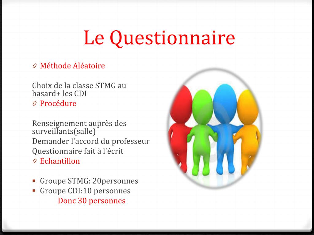 Le Questionnaire • Méthode Aléatoire Choix de la classe STMG au hasard+ les CDI • Procédure Renseignement auprès des surveillants(salle) Demander l'accord du professeur Questionnaire fait à l'écrit • Echantillon • Groupe STMG: 20personnes • Groupe CDI:10 personnes Donc30 personnes