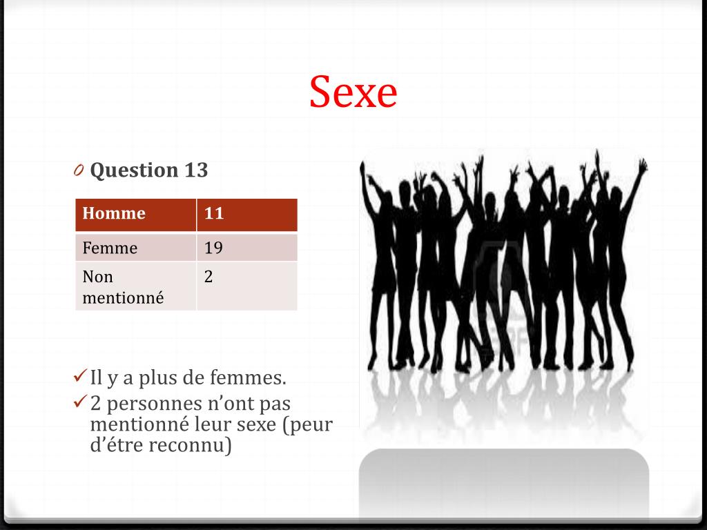 Sexe • Question 13 • Il y a plus de femmes. • 2 personnes n’ont pas mentionné leur sexe (peur d’étre reconnu)