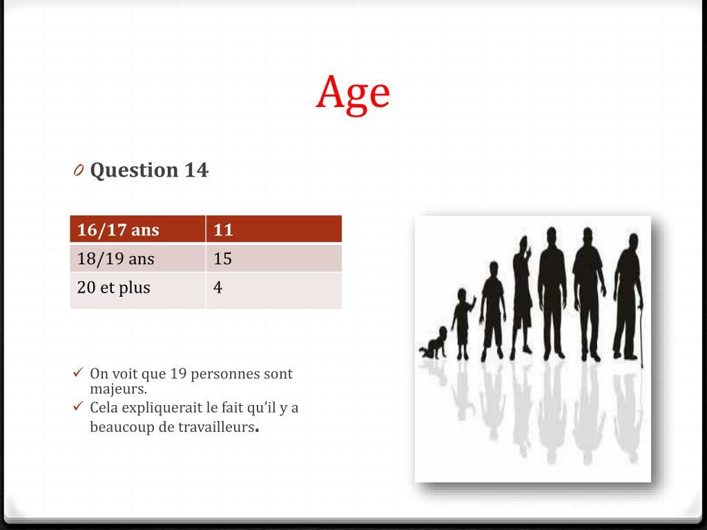 Age • Question 14 • On voit que 19 personnes sont majeurs. • Cela expliquerait le fait qu’il y a beaucoup de travailleurs.