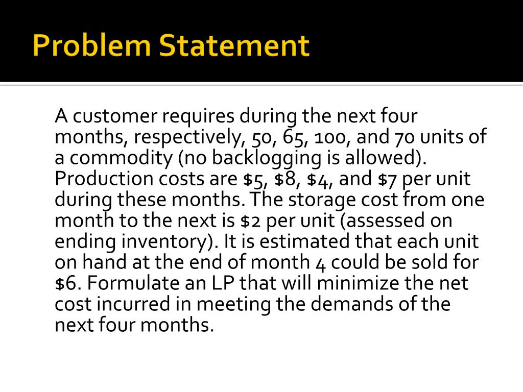 Problem Statement A customer requires during the next four months, respectively, 50, 65, 100, and 70 units of a commodity (no backlogging is allowed). Production costs are $5, $8, $4, and $7 per unit during these months. The storage cost from one month to the next is $2 per unit (assessed on ending inventory). It is estimated that each unit on hand at the end of month 4 could be sold for $6. Formulate an LP that will minimize the net cost incurred in meeting the demands of the next four months.