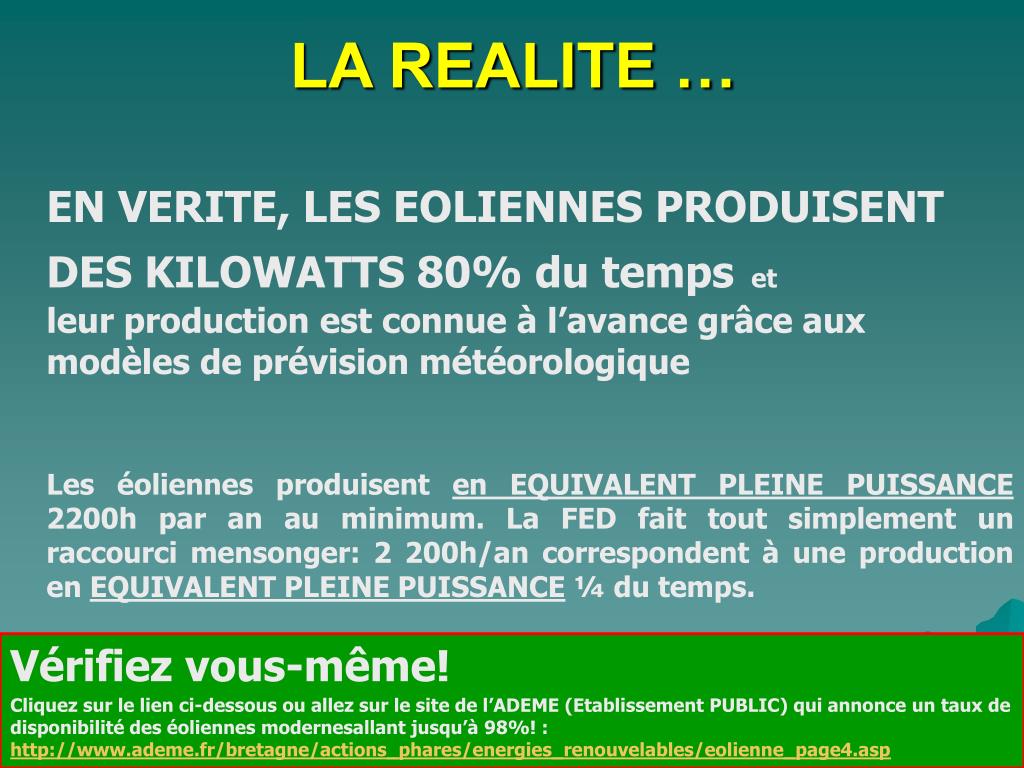 LA REALITE … EN VERITE, LES EOLIENNES PRODUISENT DES KILOWATTS 80% du tempset leur production est connue à l’avance grâce aux modèles de prévision météorologique Les éoliennes produisent en EQUIVALENT PLEINE PUISSANCE 2200h par an au minimum. La FED fait tout simplement un raccourci mensonger: 2 200h/an correspondent à une production en EQUIVALENT PLEINE PUISSANCE ¼ du temps. Vérifiez vous-même! Cliquez sur le lien ci-dessous ou allez sur le site de l’ADEME (Etablissement PUBLIC) qui annonce un taux de disponibilité des éoliennes modernesallant jusqu’à 98%! : http://www.ademe.fr/bretagne/actions_phares/energies_renouvelables/eolienne_page4.asp C’est FAUX