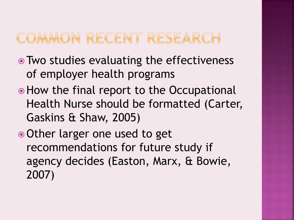 Common Recent Research • Two studies evaluating the effectiveness of employer health programs • How the final report to the Occupational Health Nurse should be formatted (Carter, Gaskins & Shaw, 2005) • Other larger one used to get recommendations for future study if agency decides (Easton, Marx, & Bowie, 2007)