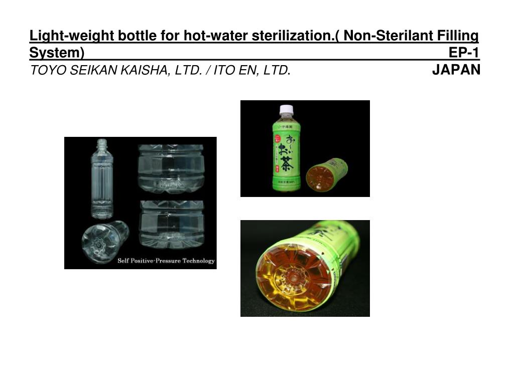 Light-weight bottle for hot-water sterilization.( Non-Sterilant Filling System) EP-1TOYO SEIKAN KAISHA, LTD. / ITO EN, LTD. JAPAN