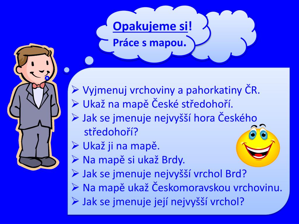 Opakujeme si! Práce s mapou. • Vyjmenuj vrchoviny a pahorkatiny ČR. • Ukaž na mapě České středohoří. • Jak se jmenuje nejvyšší hora Českého • středohoří? • Ukaž ji na mapě. • Na mapě si ukaž Brdy. • Jak se jmenuje nejvyšší vrchol Brd? • Na mapě ukaž Českomoravskou vrchovinu. • Jak se jmenuje její nejvyšší vrchol?
