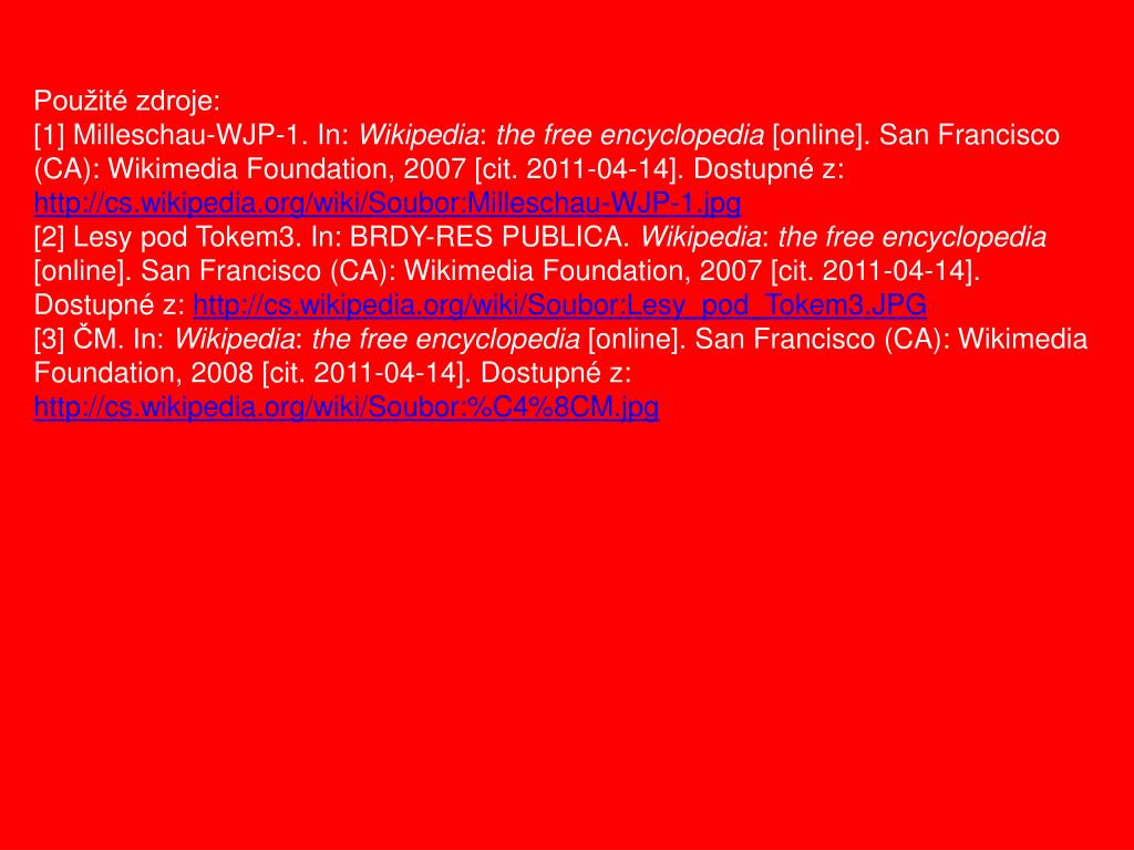Použité zdroje: [1] Milleschau-WJP-1. In: Wikipedia: the free encyclopedia [online]. San Francisco (CA): Wikimedia Foundation, 2007 [cit. 2011-04-14]. Dostupné z: http://cs.wikipedia.org/wiki/Soubor:Milleschau-WJP-1.jpg [2] Lesy pod Tokem3. In: BRDY-RES PUBLICA. Wikipedia: the free encyclopedia [online]. San Francisco (CA): Wikimedia Foundation, 2007 [cit. 2011-04-14]. Dostupné z: http://cs.wikipedia.org/wiki/Soubor:Lesy_pod_Tokem3.JPG [3]ČM. In: Wikipedia: the free encyclopedia [online]. San Francisco (CA): Wikimedia Foundation, 2008 [cit. 2011-04-14]. Dostupné z: http://cs.wikipedia.org/wiki/Soubor:%C4%8CM.jpg