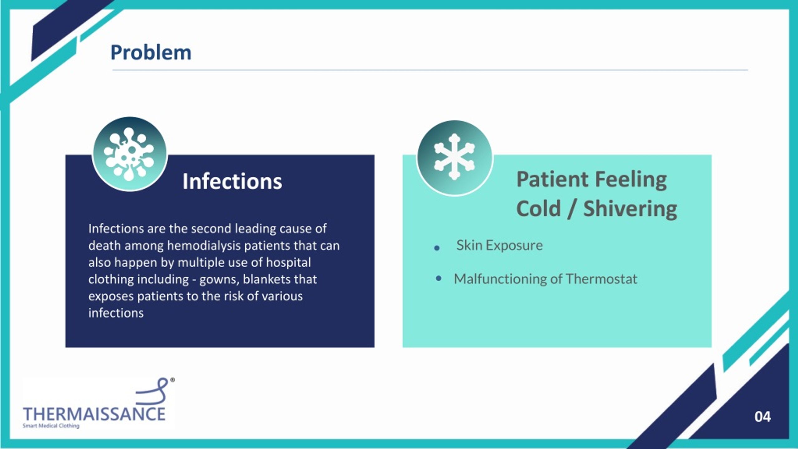 Problem Patient Feeling Cold / Shivering Infections Infections are the second leading cause of death among hemodialysis patients that can also happen by multiple use of hospital clothing including - gowns, blankets that exposes patients to the risk of various infections Skin Exposure Malfunctioning of Thermostat 04