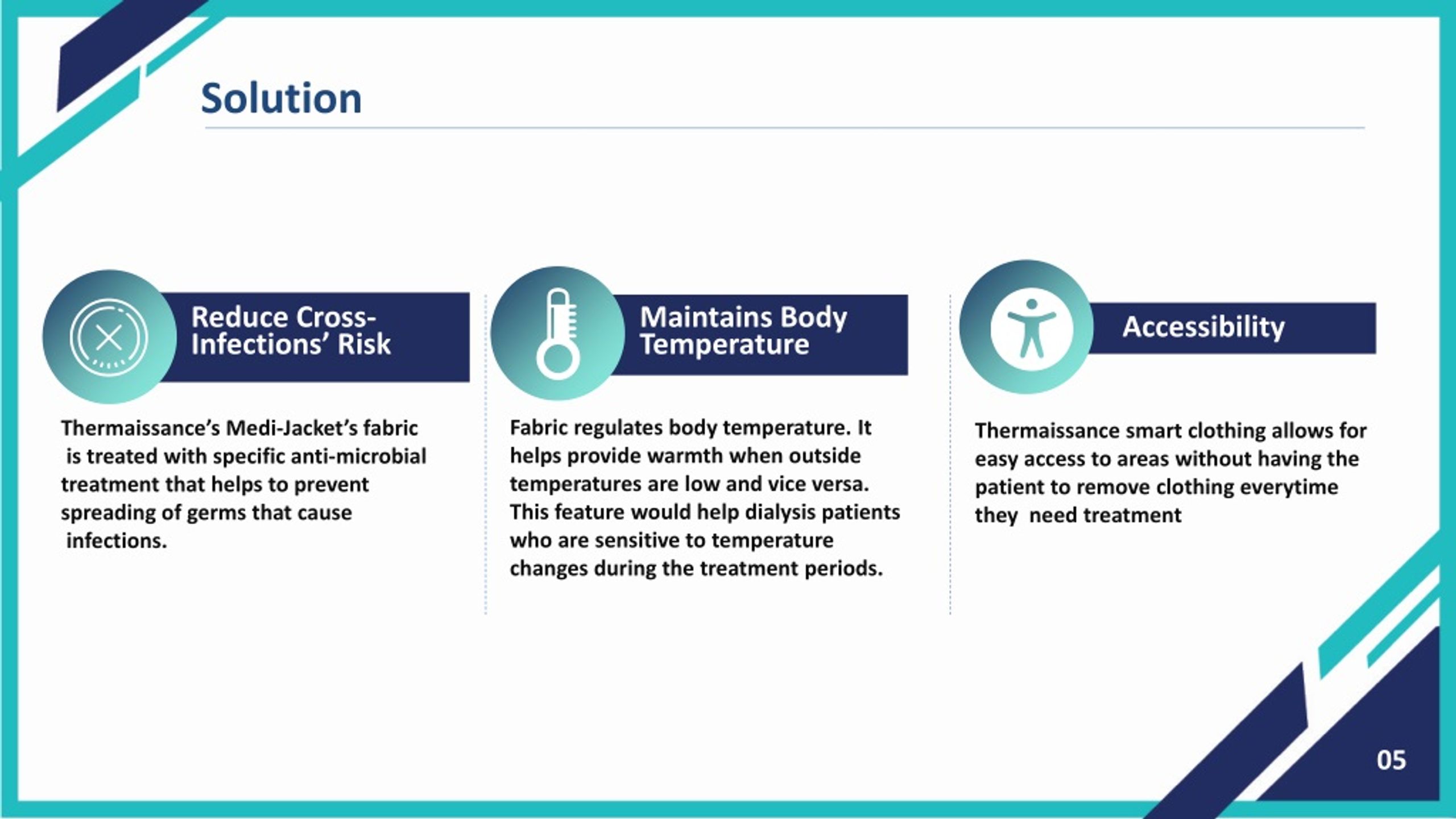 Solution Accessibility Reduce Cross-Infections’ Risk Maintains Body Temperature Fabric regulates body temperature. It helps provide warmth when outside temperatures are low and vice versa. This feature would help dialysis patients who are sensitive to temperature changes during the treatment periods. Thermaissance’sMedi-Jacket’s fabric is treated with specific anti-microbial treatment that helps to prevent spreading of germs that cause infections. Thermaissance smart clothing allows for easy access to areas without having the patient to remove clothing everytime they need treatment 05