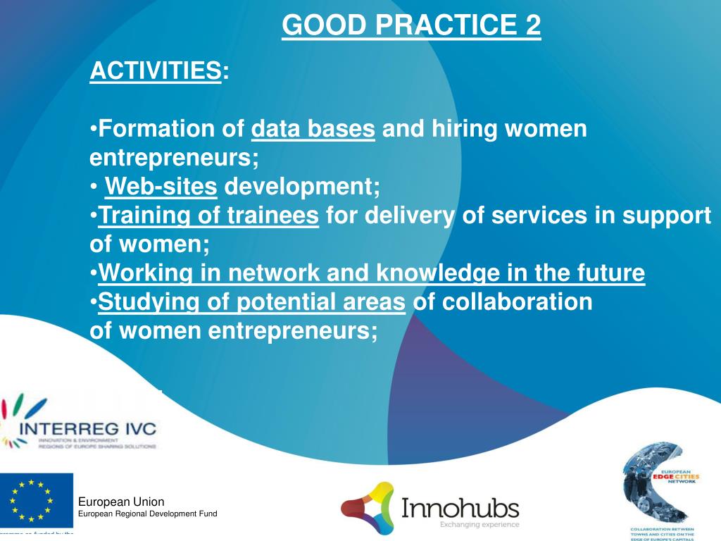 GOOD PRACTICE 2 • ACTIVITIES: • Formation of data bases and hiring women entrepreneurs; • Web-sites development; • Training of trainees for delivery of services in support of women; • Working in network and knowledge in the future • Studying of potential areas of collaboration • of women entrepreneurs; European Union European Regional Development Fund