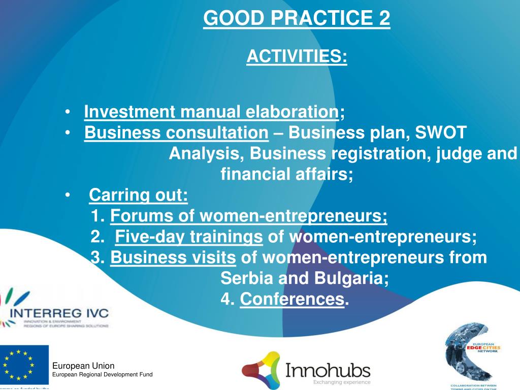 GOOD PRACTICE 2 • ACTIVITIES: • Investment manual elaboration; • Business consultation – Business plan, SWOT Analysis, Business registration, judge and financial affairs; • Carring out: • Forums of women-entrepreneurs; • Five-day trainings of women-entrepreneurs; • Business visits of women-entrepreneurs from Serbia and Bulgaria; • 4. Conferences. European Union European Regional Development Fund