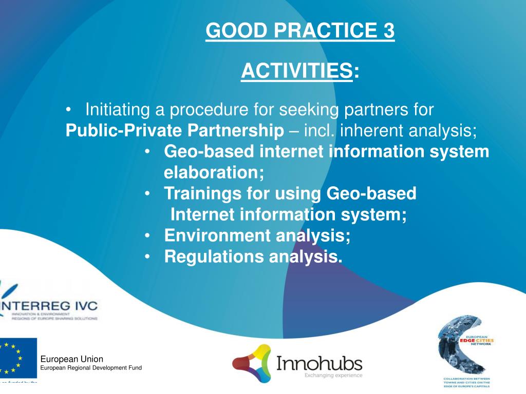 GOOD PRACTICE 3 • ACTIVITIES: • Initiating a procedure for seeking partners for • Public-Private Partnership – incl. inherent analysis; • Geo-based internet information system elaboration; • Trainings for using Geo-based • Internet information system; • Environment analysis; • Regulations analysis. European Union European Regional Development Fund