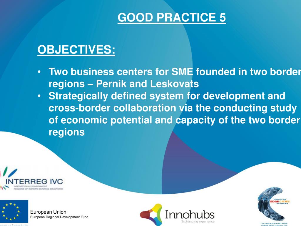 GOOD PRACTICE 5 • RESULTS: • Two business centers for SME development and promotion of collaborative activity between the two border regions – Pernik and Leskovats – are institutionalized • Strategically defined system for developmentand cross-border collaboration is established via the conducted study of economic potential and capacity of the two border regions. • Sustainable contacts between the SME representatives are created aiming effective exploitation and management of the border territories, increase of competitiveness in order to enter foreign markets – by conduction of work meetings, workshops, etc. • A Strategy for general marketing approachin new and already existing European markets is developed. • Promotional activities for presentation of • project products are conducted. European Union European Regional Development Fund