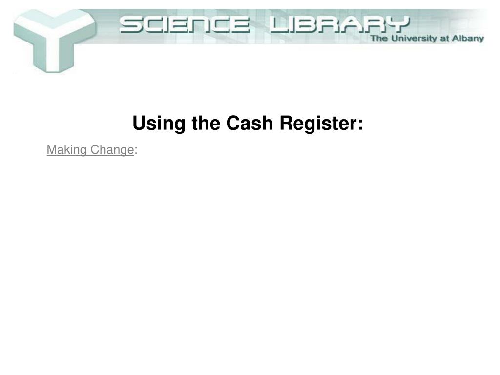 Using the Cash Register • Collecting fines (with MasterCard or Visa): • Give patron copy of the aleph receipt with the register receipt stapled to it. Also make sure you give the patron any check-in slips you may have. • Write you name on the second copy of the Aleph receipt and place face down in the tray labeled “Carbon Copy of Payment Receipts.”