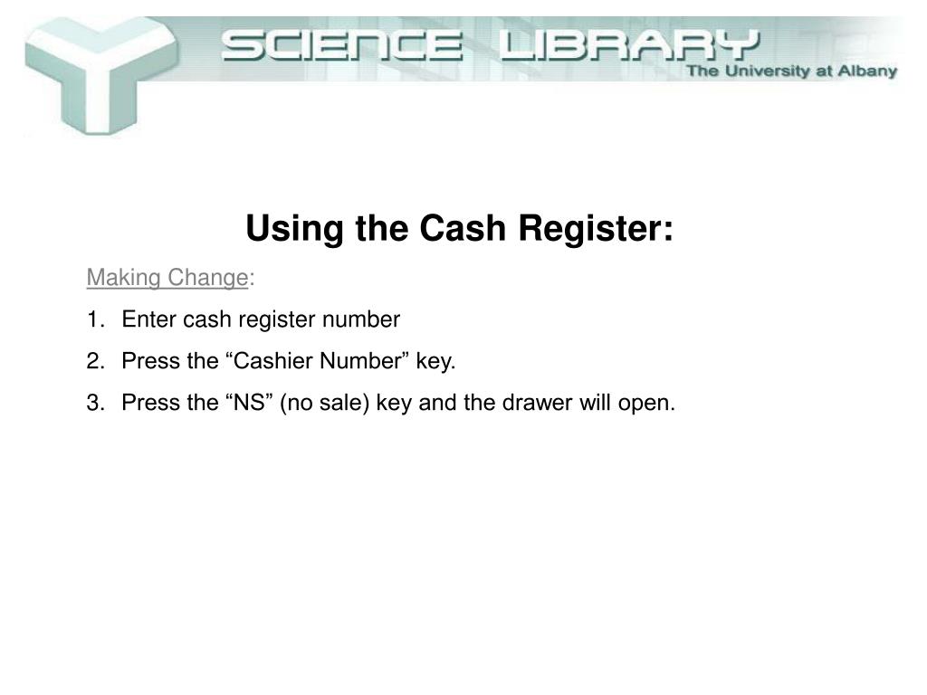 Using the Cash Register: • Making Change: • Enter cash register number • Press the “Cashier Number” key. • Press the “NS” (no sale) key and the drawer will open. • Make proper change and recount the money as you hand it to the patron.
