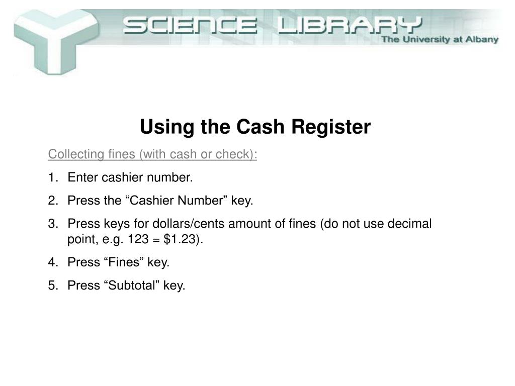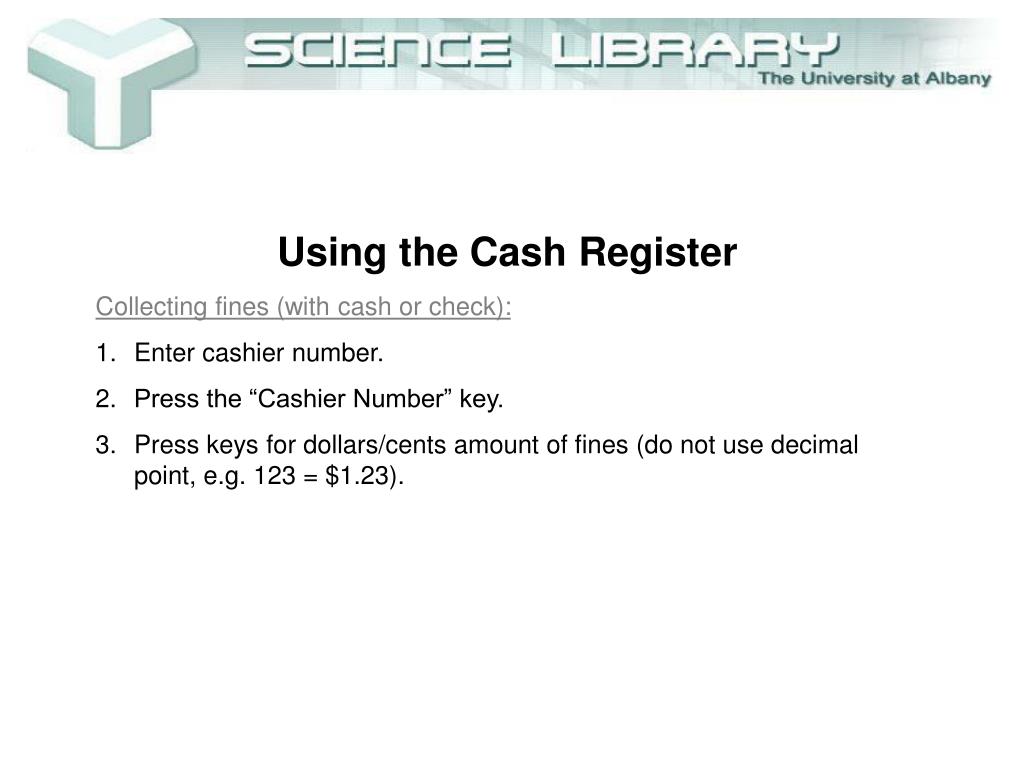 Using the Cash Register • Collecting fines (with cash or check): • Enter cashier number. • Press the “Cashier Number” key. • Press keys for dollars/cents amount of fines (do not use decimal point, e.g. 123 = $1.23).