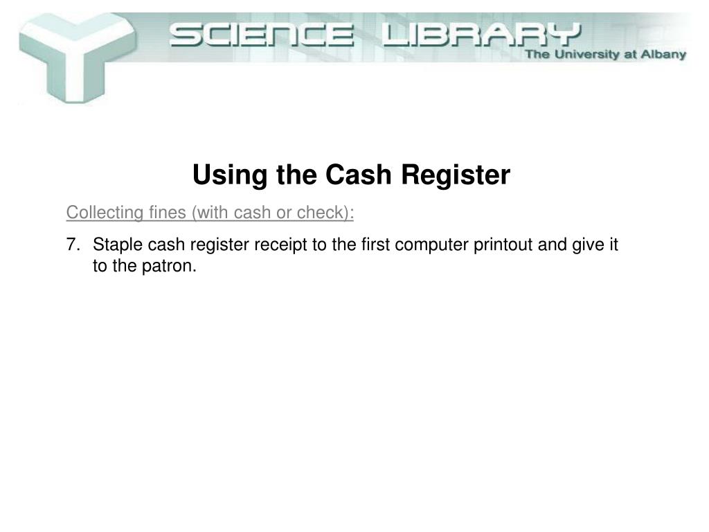 Using the Cash Register • Collecting fines (with cash or check): • Staple cash register receipt to the first computer printout and give it to the patron. • Take second computer printout, initial it, and place face down in the tray labeled “Carbon Copy of Payment Receipts.